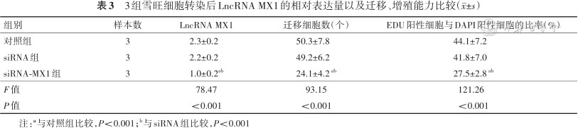 qRT-PCR结果显示,转染LncRNA MX1 siRNA后,siRNA-MX1组LncRNA MX1的相对表达量低于对照组、siRNA组,差异有统计学意义(P值均<0.001),而对照组和siRNA组间差异无统计学意义(P>0.05)。见表3。