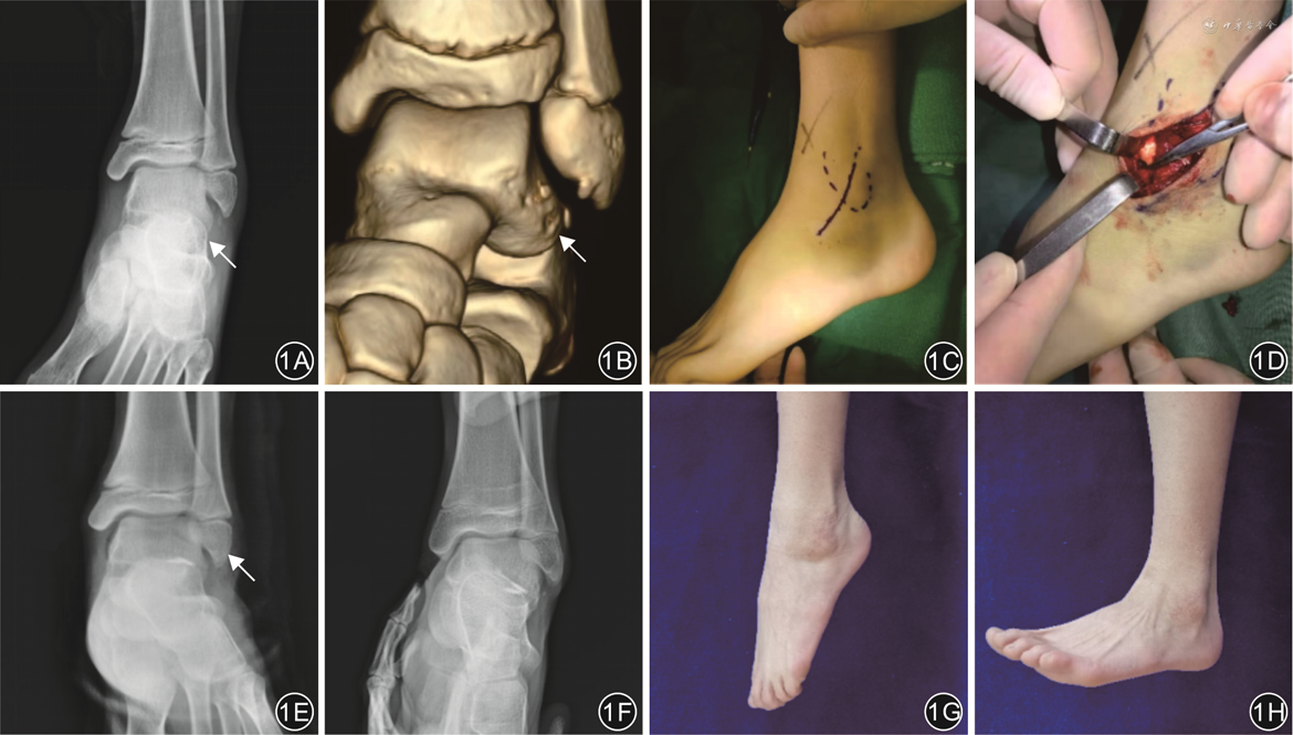 术后患肢抬高,冰敷切口部位。术后第2天,行髋、膝关节及足趾的主、被动屈伸活动,以及行腓骨肌等小腿肌肉的等长收缩训练。术后2周拆线,更换硬质支具。术后4周支具保护下部分负重行走,避免内翻活动。术后6周去除支具,开始踝关节内翻活动训练,逐步下地全负重活动。术后8~12周踝周肌力训练加强,全负重行走。