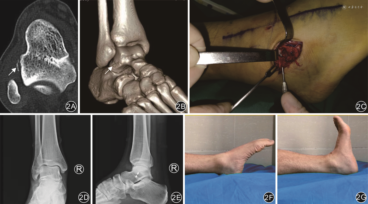 患者取仰卧位,采用椎管内麻醉联合神经阻滞。患侧大腿根部固定止血带,充气加压至50 kPa。以距骨外侧撕脱骨块定位为中心,于外踝前外侧做2.5~3.0 cm弧形手术切口,依次切开皮肤、皮下组织,皮下分离时注意保护腓浅神经外侧支。沿距腓前韧带走向暴露至距骨侧止点,见距腓前韧带距骨侧止点连带部分骨皮质完全撕脱,将踝关节内翻暴露出撕脱骨折块,清理断端淤血,大量生理盐水冲洗切口。选择2枚2.8 mm金属锚钉(上海凯利台医疗科技公司,T418型)固定,定位进针点为距骨侧距腓前韧带止点处,电钻钻孔,置入金属锚定,1枚打向内上方,1枚水平位置入。术中根据距腓前韧带距骨侧止点撕脱骨折块大小,选择固定材料,缝合复位固定骨折块,将韧带缝合加强。缝合牢靠后,术中C臂X线机透视确认锚钉位置满意,检查踝关节已稳定。常规缝合,加压包扎。踝关节石膏固定于轻度外翻位。