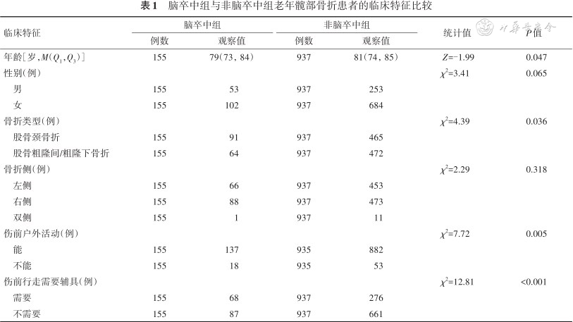 (2)比较脑卒中组与非脑卒中组患者的年龄、性别、骨折类型、骨折侧别、伤前能否户外活动、伤前行走是否需要辅具等临床特征的差异。脑卒中后遗症包括:肢体活动不利、语言含混、性格改变、认知障碍、情感表达异常、平衡力差、咀嚼困难、饮食呛咳。