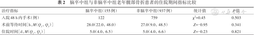 脑卒中组患者与非脑卒中组术前等待时间分别为1~366 h、0~311 h,住院时间分别为1.7~28.6 d、1.5~111.2 d。2组间入院48 h内手术率、术前等待时间、住院时间比较,差异均无统计学意义(P值均>0.05),见表2。