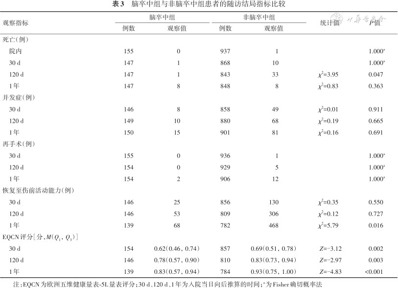 脑卒中组与非脑卒中组患者的随访结局指标比较