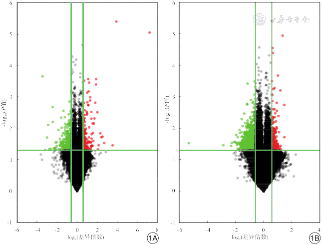 注:红色为显著上调基因;绿色为显著下调基因;黑色为无差异变化的基因