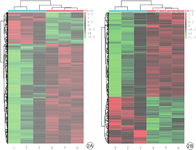 注:1~3为阿尔茨海默病组小鼠脑组织基因样本,4~6为对照组小鼠脑组织基因样本;纵轴为基因聚类,一行代表一个基因;不同颜色为基因的相对表达量,红色代表上调的表达,绿色代表下调的表达,颜色越亮基因相对表达量越高