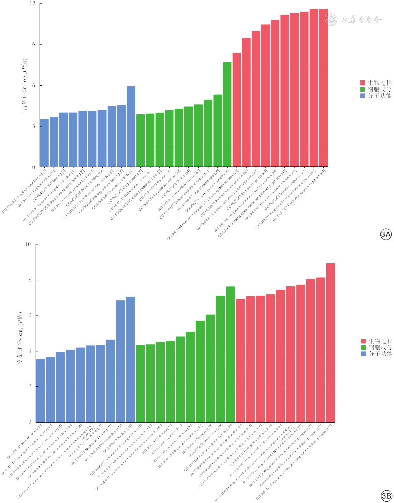 GO富集分析:529个差异表达的mRNA中,表达上调的mRNA参与812个生物学过程,表达下调的mRNA参与870个生物学过程,差异均有统计学意义(P值均<0.05)。上调的差异表达mRNA主要富集于趋化因子活动、MHC蛋白复合物以及对外部生物刺激的反应等生物过程;下调的差异表达mRNA主要富集于蛋白结合、对初级代谢过程的调节、氮化合物代谢过程的调节等生物过程。差异表达mRNA富集评分前10的GO分析条目见图3。