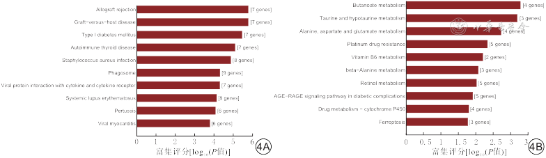 KEGG通路富集分析:529个差异表达的mRNA中,表达上调的mRNA富集得到32条通路,表达下调的mRNA富集得到16条通路,差异均有统计学意义(P值均<0.05)。上调的差异表达mRNA主要富集于异体移植排斥反应、移植物抗宿主病、自身免疫性甲状腺疾病等炎症反应通路;下调的差异表达mRNA主要富集于丁酸盐代谢、牛磺酸和次牛磺酸代谢、谷氨酸代谢等氨基酸代谢途径。KEGG通路分析富集评分前10的通路见图4。