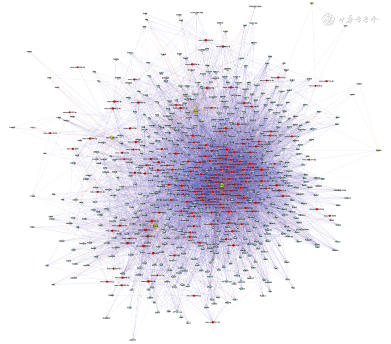 注:红色圆圈为微小RNA(miRNA);蓝色圆圈为信使RNA(mRNA);绿色圆圈为长链非编码RNA(LncRNA)