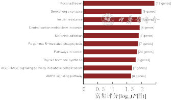 对ceRNA预测的靶基因进行GO和KEGG通路分析:GO分析显示,550个差异表达的mRNA富集得到1 414个GO条目(P值均<0.05),其主要富集于蛋白结合、细胞连接以及生物调节等生物过程;KEGG通路分析发现,550个差异表达的mRNA富集得到27条通路(P值均<0.05),主要富集于胰岛素抵抗、Fcγ介导的吞噬作用、糖尿病并发症中的AGE-RAGE信号通路和AMPK信号通路等。见图6、7。