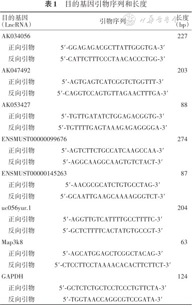 主要试剂:Arraystar小鼠LncRNA 芯片(V4.0)、Arraystar基因芯片配套试剂盒、2×PCR master mix试剂盒为美国Arraystar公司产品;Trizol试剂、SuperScriptTM Ⅲ RT master mix试剂盒为美国Invitrogen公司产品;RNeasy Mini Kit试剂盒为美国Qiagen公司产品。