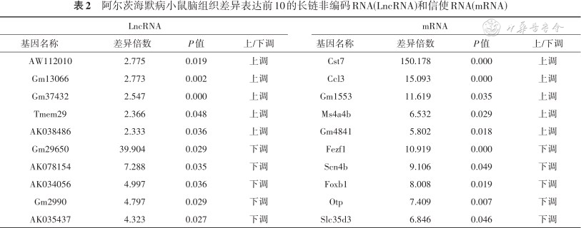 阿尔茨海默病小鼠脑组织差异表达前10的长链非编码RNA(LncRNA)和信使RNA(mRNA)