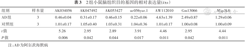 qRT-PCR结果显示,AD组与对照组相比,LncRNA AK034056、AK047492、AK053427和uc056yur.1 表达下调,LncRNA AW112010、Gm13066和Map3k8表达上调,差异均有统计学意义(P值均<0.05),见表3。检测结果与芯片结果相符。