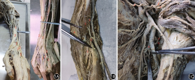 国人桡神经浅支在外上髁平面的横径为(2.63±0.03)mm,55.17%±9.23%的前臂外侧皮神经在肱骨内、外上髁连线上方穿出深筋膜,44.83%±9.23%在连线下方穿出,主干长度(65.03±5.57)mm、宽度(2.04±0.07)mm、厚度(1.36±0.34)mm,分布到前臂前面桡侧半、前臂后面远侧1/3桡侧半皮肤[1]。正常桡神经浅支属于皮支,从肱骨外上髁前外侧下行,转向背侧至手背区,分成4~5支指背神经,分别分布于手部的桡侧半和桡侧的1/2手指近节背面的皮肤和关节。本例桡神经浅支较正常的桡神经浅支细小,且前臂外侧皮神经代替桡神经浅支分布在前臂和手背区域,两者间无吻合支,支配手背桡侧半、虎口区以及桡侧的1/2手指近节背面的皮肤感觉。在既往文献报道中已有提及前臂外侧皮神经代替桡神经浅支、桡神经浅支缺如、桡神经浅支与前臂外侧皮神经吻合等情况[2, 3, 4, 5]。本例标本中桡神经浅支未缺如,且也未与前臂外侧皮神经吻合,而是变异为肌肉支支配肱桡肌与桡侧腕屈肌,与既往文献报道不同。在临床上,当患者的手背桡侧半皮肤或者虎口区感觉功能障碍,应考虑前臂外侧皮神经与桡神经浅支变异的可能。伴有此类变异的患者发生肱骨中段骨折时,由于肌皮神经替代了部分桡神经的功能,患者桡神经损伤时出现的前臂背侧麻木、手背桡侧半麻木、手腕拇指伸直时无力或者无法伸直等临床症状会减轻,尤其是手背桡侧半的感觉基本上不受影响;进行血气分析时,由于桡神经浅支变异为肌支且较为细小,可减小穿刺对桡神经浅支的损伤;在治疗心肌梗死或心绞痛行经皮冠状动脉介入时,有此类变异的患者,正常情况下桡神经分布区的感觉异常症状会减少[6]。