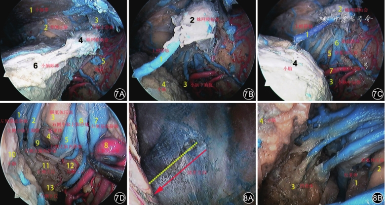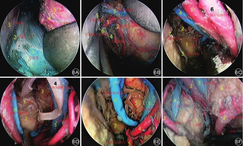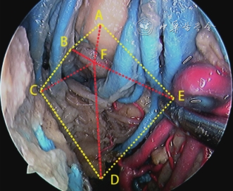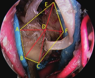 完全神经内镜模拟手术中,打开四叠体池后、切开小脑幕前,观察并定位以下6个标志点:A、B点分别为左侧上、下丘外侧缘与小脑中脑裂静脉交点,C点为左侧下丘下缘,D点为四叠体的中心,E点为右侧上丘基底静脉上交点,F点为右上丘基底静脉下交点。导航棒确定点位后利用神经导航的测量功能测量AB、BC、CF、FE、EA点连线及上述各点与D点连线的长度,每个项目测量3次,取平均值;经海伦公式计算分别得出△ADB、△BDC、△ADE、△EDF和△FDC等5个三角形的面积,相加后数值为切开小脑幕前松果体区最大暴露面积。见图1。