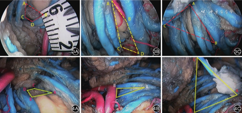 (1)第1手术间隙(双侧大脑内静脉间隙)。取以下4个标志点测量并计算:A点为左侧大脑内静脉与胼胝体压部交点,B点为右侧大脑内静脉的交点,C点为左侧大脑内静脉与松果体下方交点,D点为右侧大脑内静脉与松果体下方交点。△ACD和△ABD的面积和为第1手术间隙最大显露面积。(2)第2间隙(右侧大脑内静脉与右侧基底静脉间隙)。取以下4个标志点测量并计算:A点为右侧脉络膜后内侧动脉与右侧大脑内静脉交点,B点为右侧脉络膜后内侧动脉与右侧基底静脉交点,C点为可见的右侧大脑内静脉末端最远点,D点为可见的右侧基底静脉末端最远点。△ACD和△ABD的面积和为第2手术间隙最大显露面积。(3)第3间隙(大脑大静脉与右侧基底静脉间隙)。取以下3个标志点测量并计算:A点为右侧基底静脉与大脑大静脉处交点,B点为右侧基底静脉与胼胝体压部交点,C点为左侧基底静脉与上蚓静脉的交点。△ABC的面积为第3手术间隙最大显露面积。测量与计算方法同上。见图3。