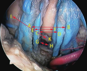 完全神经内镜模拟手术中,切开小脑幕、分离蛛网膜、牵开右侧的小脑上脚静脉后,观察并定位以下6个标志点:A点为胼胝体压部中心点、B点为松果体左外侧缘最远点、C点为左侧基底静脉与左侧上丘最近处交点、D点为左下丘下缘最低点、E点为右侧基底静脉与右侧侧上丘最近处交点、F点为松果体中心点。测量AB、BC、CD、DE、EA点连线及上述各点与F点连线的长度,每个项目测量3次,取平均值;然后经计算得出△AFB、△BFC、△CFD、△DFE和△EFA共5个三角形的面积之和,即切开小脑幕后松果体区最大显露面积。测量与计算方法同上。见图2。
