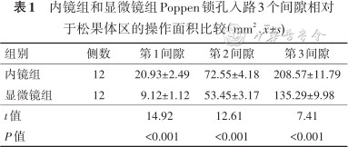 内镜组和显微镜组Poppen锁孔入路3个间隙相对于松果体区的操作面积比较(mm2,±s)