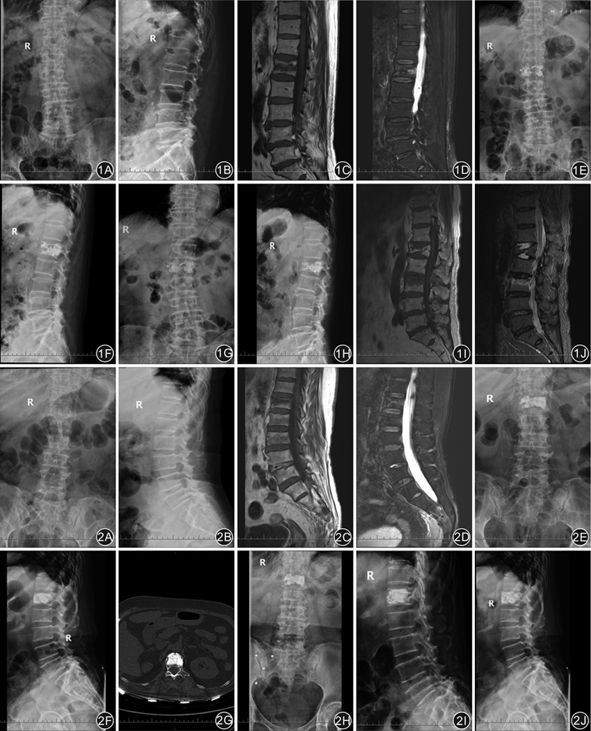 术后当天予以卧床休息,并给予抗感染、镇痛、抗骨质疏松(包括口服钙剂+维生素D和每年静脉滴注5 mg唑来膦酸1次)等对症处理。术后第1天可佩戴腰围下床进行康复功能锻炼。术后第1天复查X线片、CT,了解骨水泥分布及骨水泥渗漏情况。出院后门诊定期复诊并行X线片、骨密度检查,观察患者术后恢复情况及手术相关并发症的发生情况。