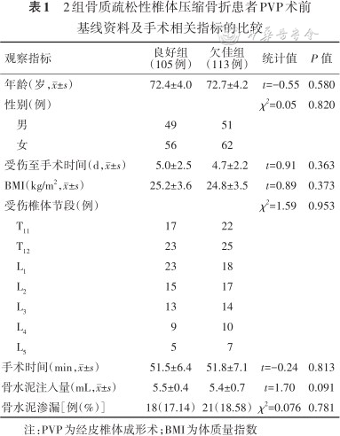 回顾性队列研究。纳入2018年12月—2020年12月南京医科大学第四附属医院单节段OVCFs患者218例,其中男100例、女118例,年龄65~79(72.6±4.1)岁。218例患者均行PVP治疗,按术后第1天X线检查的骨水泥分布情况分为良好组105例和欠佳组113例。(1)比较2组患者年龄、性别、受伤至手术时间及体质量指数(BMI)等基线资料;(2)比较2组患者手术时间、骨水泥注入量、骨水泥渗漏情况;(3)比较2组患者术后第1天、术后1年的疼痛视觉模拟评分法(VAS)评分、Oswestry功能障碍指数(ODI)、Cobb 角、椎体前缘高度(AVH)、椎体后缘高度(PVH),以及术后1年骨密度变化和邻近椎体骨折、椎体高度再丢失、残余痛的发生情况。