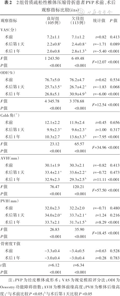 (1)2组患者年龄、性别、受伤至手术时间、BMI等基线资料比较,差异均无统计学意义(P值均>0.05)。(2)218例患者均顺利手术,均无脊髓神经损伤等并发症。2组手术时间、骨水泥注入量、骨水泥渗漏情况比较,差异均无统计学意义(P值均>0.05)。(3)218例患者均获随访1年,良好组发生邻近椎体骨折3例、椎体高度丢失8例、残余痛6例,欠佳组发生邻近椎体骨折11例、椎体高度丢失20例、残余痛18例。良好组术后1年邻近椎体骨折、椎体高度丢失、残余痛发生率均低于欠佳组,差异均有统计学意义(χ2=4.28、4.94、5.80,P值均<0.05)。组内比较:与术前比较,2组患者术后第1天VAS评分、ODI及Cobb角均减少,AVH及PVH均增大,差异均有统计学意义(P值均<0.001)。与术后第1天比较,良好组术后1年VAS评分、ODI、Cobb角及AVH、PVH差异均无统计学意义(P值均>0.05);欠佳组术后1年VAS评分、ODI及Cobb角增大,AVH、PVH减小,差异均有统计学意义(P值均<0.001)。2组术后1年的骨密度与术前比较,差异均有统计学意义(P值均<0.001)。组间比较:2组患者术前和术后第1天VAS评分、ODI、Cobb角、AVH、PVH比较,差异均无统计学意义(P值均>0.05);良好组术后1年VAS评分、ODI、Cobb角均小于欠佳组,AVH、PVH均大于欠佳组,差异均有统计学意义(P值均<0.05);术前、术后1年的骨密度2组间差异均无统计学意义(P=0.528,0.783)。