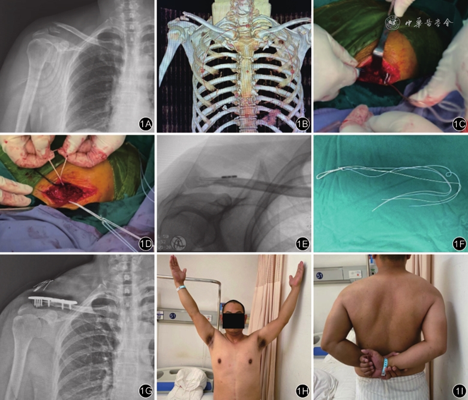 术后24 h内常规抗生素预防感染,患侧前臂吊带悬吊。术后早期行肩部以下(手、腕及肘关节)主动屈伸活动,术后1周患侧肩部逐步开始被动功能锻炼(被动锻炼不可超过肩关节水平);术后4周逐步加强被动锻炼,并结合主动锻炼;术后每月复查X线,根据骨折愈合情况,制定训练计划,直至患侧肩部逐渐恢复正常活动。