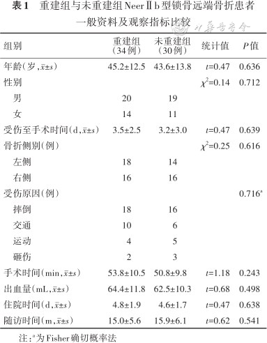 重建组与未重建组NeerⅡb型锁骨远端骨折患者一般资料及观察指标比较
