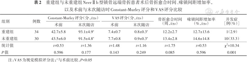 重建组术后1例(2.9%,1/34)出现外展功能轻度受限,其余患者术后无神经血管损伤、喙突骨折、切口感染等并发症。未重建组中10例(33.3%,10/30)发生并发症,其中术后4例患者出现肩锁关节半脱位(Rockwood分型Ⅰ~Ⅱ度),3例患者出现肩关节活动受限,2例患者骨折延迟愈合,1例患者术后退钉。2组术后并发症发生率比较,差异有统计学意义(P<0.001)。见表2。