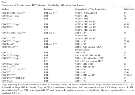 Tregs: regulatory T-cells; HBV: hepatitis B virus; HC: healthy control; CD: cluster of differentiation; Foxp3: forkhead box protein 3; PBT: peripheral blood Tregs; IHT: intrahepatic Tregs; ACLF: acute-on-chronic liver failure; AsC: asymptomatic carriers; CHB: chronic hepatitis B; TIT: tumor infiltrating Tregs; AHB: acute hepatitis B; CTLA-4: cytotoxic T-lymphocyte antigen-4; >: significantly higher; <: significantly lower; =: no significant difference.