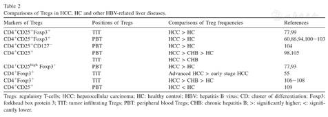 Tregs: regulatory T-cells; HCC: hepatocellular carcinoma; HC: healthy control; HBV: hepatitis B virus; CD: cluster of differentiation; Foxp3: forkhead box protein 3; TIT: tumor infiltrating Tregs; PBT: peripheral blood Tregs; CHB: chronic hepatitis B; >: significantly higher; <: significantly lower.