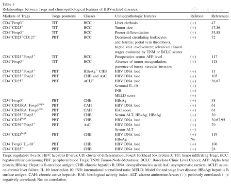 Tregs: regulatory T-cells; HBV: hepatitis B virus; CD: cluster of differentiation; Foxp3: forkhead box protein 3; TIT: tumor infiltrating Tregs; HCC: hepatocellular carcinoma; PBT: peripheral blood Tregs; TNM: Tumor-Node-Metastasis; BCLC: Barcelona Clinic Liver Cancer; AFP: Alpha fetal protein; HBeAg: Hepatitis B envelope antigen; CHB: chronic hepatitis B; DNA: deoxyribonucleic acid; AsC: asymptomatic carriers; ACLF: acute-on-chronic liver failure; IL-10: interleukin-10; INR: international normalized ratio; MELD: Model for end stage liver disease; HBsAg: hepatitis B surface antigen; CAH: chronic active hepatitis; HAI: histological activity index; ALT: alanine aminotransferase; (+): positively correlated; (-): negatively correlated; No: no correlation.