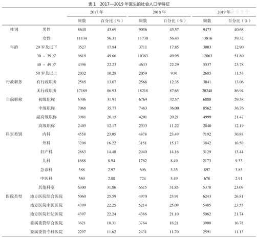 在有效参与2017年、2018年和2019年三次调查的医生中,女性医生占比高于男性医生;在年龄分布上,30~39岁的医生占了50%左右;无行政职务的医生占到了绝大多数(三次调查占比均超过85%);在职称分布上,以初级职称和中级职称的医生为主(占比近70%);在科室分布上,儿科、急诊科和中医科的医生占比相对较少;在医院类型分布上,地方医院的医生占70%左右,委属委管医院医生占30%左右。有效参与2017年、2018年和2019年三次调查医生的社会人口学分布特征基本一致,说明调查结果具有较好的可比性。详见表1。