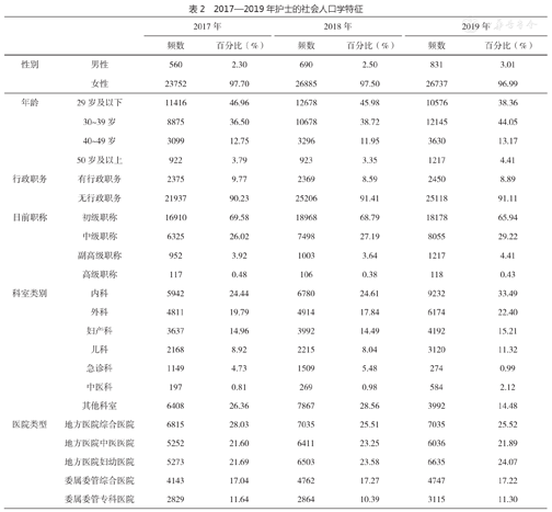 在有效参与2017年、2018年和2019年三次调查的护士中,女性护士占比远高于男性护士;在年龄分布上,以39岁及以下的护士为主,占了85%左右;无行政职务的护士占到了绝大多数(三次调查占比均超过90%);在职称分布上,以初级职称和中级职称的护士为主,其中初级职称护士占到近70%;在科室分布上,儿科、急诊科和中医科的护士占比相对较少;在医院类型分布上,地方医院的护士占70%左右,委属委管医院护士占30%左右。有效参与2017年、2018年和2019年三次调查护士的社会人口学分布特征基本一致,说明调查结果具有较好的可比性。详见表2。