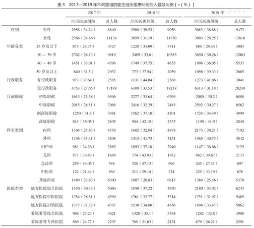 2017—2019年不同亚组的医生经历医患纠纷的人数及比例[n(%)]