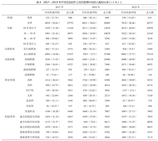 从2017—2019年三年的调查结果看,护士经历医患纠纷的比例在总体上呈现以下特征:男性护士的总人数虽然相对较少,但经历医患纠纷的比例要高于女性护士;年龄在29岁及以下的护士,经历医患纠纷的比例相对较低,年龄在40~49岁的护士,经历医患纠纷的比例相对较高;有行政职务的护士经历医患纠纷的比例要高于无行政职务的护士;初级职称护士经历医患纠纷的比例相对较低,而副高级职称和高级职称的护士,经历医患纠纷的比例相对更高;急诊科和儿科护士经历医患纠纷的比例相对较高(2017年、2018年经历医患纠纷比例最高的科室为急诊科,分别为32%和40%,而2019年为儿科,34%),中医科护士经历医患纠纷的比例相对较低;委属委管医院护士经历医患纠纷的比例低于地方医院的护士。详见表4。