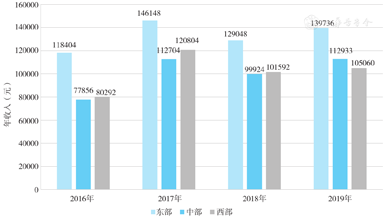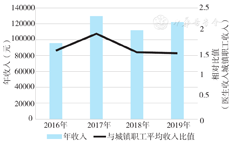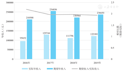 2016—2019年四年间我国主要三级公立医院医生实际年收入虽略有增加但总体变化不大,2019年自报平均实际年收入是期望收入的一半。