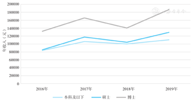 从图3可以看出,学历越高,医生的年均薪酬越高,并且随着时间的推移,学历之间的薪酬差异逐渐拉大。2016年,本科及以下医生的年均收入(83532元)与具有硕士研究生的医生收入(85044元)接近,具有博士学历的医生收入最高为131772元。到2019年,三者的差距增加,硕士的年均收入(129476元)比本科及以下医生群体的年收入(110632元)高出了17.03%。而有博士学历的医生年收入增长更快(187076元),其薪酬与本科及以下医生的比值也从2016年的157.75%增加到了169.10%。