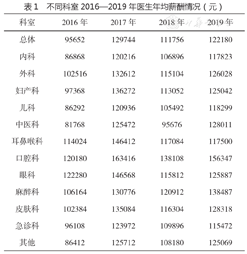 从四年的调查结果总体来看,口腔科、眼科、耳鼻喉科、手术麻醉科这四个科室是属于收入较高的科室。中医科室的收入在2016—2018三年期间一直处于最低水平,但是中医科医生在2019的年收入却升至所有科室中的第四位。相比之下,内科、儿科和急诊科这三个科室始终属于收入最低的科室(表1)。