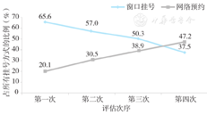 2019年第四次评估结果显示,95.8%的门诊患者直接到医院就诊,选择通过不同转诊方式到样本医院就诊的门诊患者仅占4.2%,与前三次评估(2016—2018年)结果一致。在直接到样本医院就诊的门诊患者中,通过窗口挂号的占37.5%,采取网络预约挂号的占47.2%,网络预约挂号已成为门诊患者首选的挂号方式。选择窗口挂号的门诊患者由2016年首次评估的65.6%降至2019年第四评估的37.5%,采取网络预约挂号的门诊患者由2016年首次评估的20.1%上升至2019年第四次评估的47.2%(图1)。