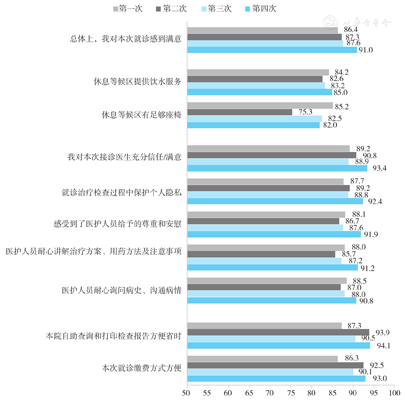 通过网络预约挂号的门诊患者比例逐年上升,由首次评估的20.1%上升至第四次评估的47.2%;门诊患者对诊疗服务相关指标的满意度连续四年处于较高水平并稳步提升;改善成效最大的是与医疗机构信息化建设相关的指标;与诊疗环境相关的指标改善成效不明显。