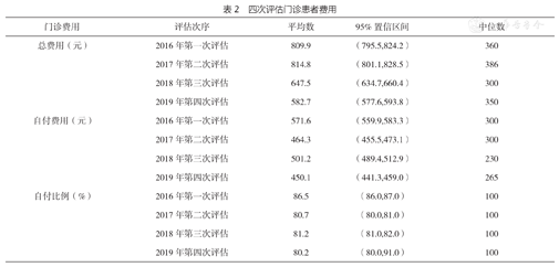 | 门诊费用 | 评估次序 | 平均数 | 95%置信区间 | 中位数 |