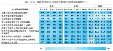 东部、中部和西部地区门诊患者在2019年第四次评估中的就诊总体满意度与2016年首次评估结果基本持平。东部地区门诊患者对缴费方式、自助查询和打印服务的满意度上升明显,分别上升了5.8%和5.4%;中部地区门诊患者对"自助查询和打印服务(上升了9.5%)及休息等候区提供饮水服务(上升了7.4%)的满意度上升明显;西部地区门诊患者对缴费方式、自助查询和打印服务及休息等候区提供饮水服务的满意度改善成效最为明显,与首次评估相比,分别上升16.5%、16.3%和12.1%,值得一提的是,西部地区在医疗机构信息化水平方面的满意度由首次评估的79.3%和74.6%上升至90%以上(表3)。但是,与诊疗环境相关指标的满意度在连续四次门诊患者调查中均低于80%,西部地区的医疗机构需要将改善诊疗环境作为下一步工作的重点之一。