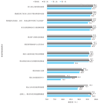 2019年第四次评估住院患者就医总体满意度为97.0%,对诊疗服务、护理服务相关指标的满意度较高,均在97%以上;但对入院和出院手续办理(95.8%)、患者向医院反映有关问题的渠道(95.7%)、病区环境(91.4%)、医院伙食(81.2%)等指标的满意度仍有提升空间。这一结果与前三次(2016—2018年)评估结果一致。
