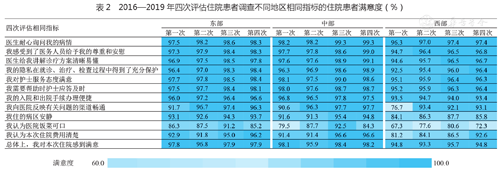 2019年第四次评估东部、中部和西部地区住院患者本次住院总体满意度分别为97.9%、98.2%和94.8%。除了东部地区住院患者对医院伙食相对而言最为认同外,中部地区住院患者本次住院总体满意度和其他各项指标的满意度均高于其他地区,西部地区住院患者各项指标的满意度都最低。东部、中部、西部地区各指标满意度差距最小的是医生耐心询问病情,差异为1.9%;差距最大的指标是医院伙食,差异为12.9%。