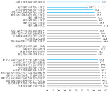 38家中医医院的门诊患者总体满意度为92.0%,满意度最高的方面是医生给予患者的尊重和安慰(93.0%),满意度最低的方面是等待取药的时间(69.7%),具体情况详见表3和图1。其中,就诊流程中等待取中草药时间的中位数为20分钟,等待取代煎汤药的时间中位数为1天。