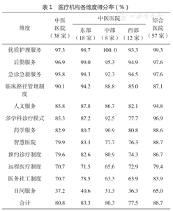 38家样本中医医院12个维度总得分率均值为80.8%,低于综合医院(88.7%);按区域划分,东部地区高于中部地区和西部地区。从各个维度的落实情况来看,得分率前三位的依次为优质护理服务、后勤服务、急诊急救服务;后三位的依次为日间服务、医务社工制度、远程医疗制度(表1)。