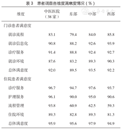 38家样本中医医院机构调查总得分率均值为80.8%,其中信息化水平、医务社工制度以及日间服务维度得分相对低一些;门诊患者总体满意度为92.0%,就诊流程满意度相对较低(83.1%);住院患者总体满意率为95.9%,但住院环境满意度相对较低(89.3%);相对于较高的患者满意度而言,只有44.1%的医务人员对目前的工作感到满意,超过半数(53.1%)的医务人员认为工作负荷重。