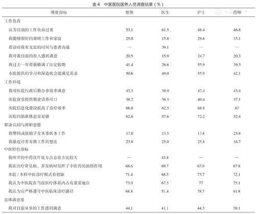 与较高的患者满意度形成强烈反差的是,中医院从业人员的职业满意度普遍偏低。调查结果显示,医务人员对目前所从事工作的满意率不足一半:超过半数的中医医务人员感到工作负荷过重,仅有1/4的医务人员表示能够较好地兼顾工作和家庭;对薪酬和福利待遇的满意度也普遍偏低,且对学习和深造机会仍有较大需求;离职意愿较高,医务人员整体离职意愿超过20%,只有13.5%的医生愿意让自己的子女从事医务工作。
