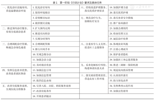 为改善人民群众看病就医体验,增加医疗服务获得感、和谐社会关系,2015年初,国家卫生计生委和国家中医药管理局印发了第一阶段《行动计划》。提出了十项35条重点任务,具体见表1。除第10项外,其余9项均要求各三级医院具体落实。每年必须落实的项目共计6项,包括第一、三、五、六、七、九项。三年内逐步落实的项目共计3项,包括第二、四、八项。