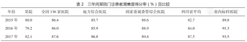 三年间,虽然该院门诊患者满意度提升了2.63%,但慢于省内标杆医院的4.12%,且每年都低于全国同类医院和全省平均水平,见表2。