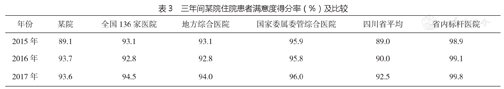 三年间,某院住院患者满意度得分率提升了5.05%,从低于全国同类医院的平均水平改善到基本持平,且维持在93%以上;从绝对数看高于全省平均,但低于省内标杆医院,见表3。