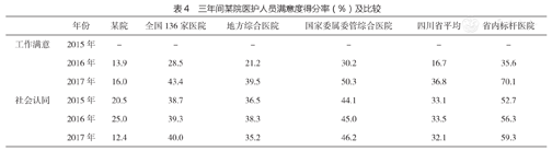 因"对目前从事工作的总体满意情况"从2016年才开始调查了解,从2年满意度得分率看,虽然某院略有提高,但不容乐观,远低于全国、全省平均水平。另外,通过"我所从事的职业得到社会认同和尊重"让医护人员对个人职业的社会认同度进行评价,得分率也较低且不稳定,见表4。
